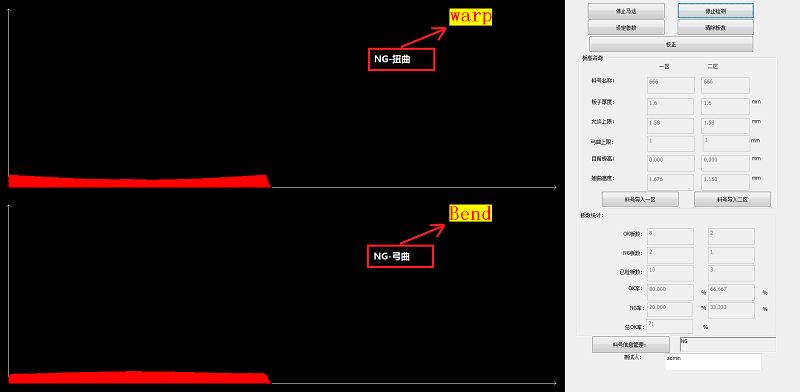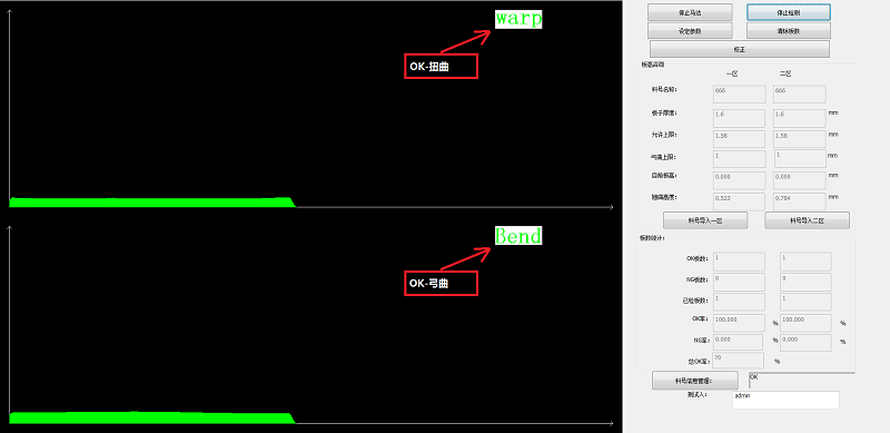 通過位置的信息可以得到PCB板的板厚曲線圖,通過特定軟件算法和翹曲度定義,計(jì)算出板翹曲度,并根據(jù)設(shè)定判斷條件得出OKNG板。