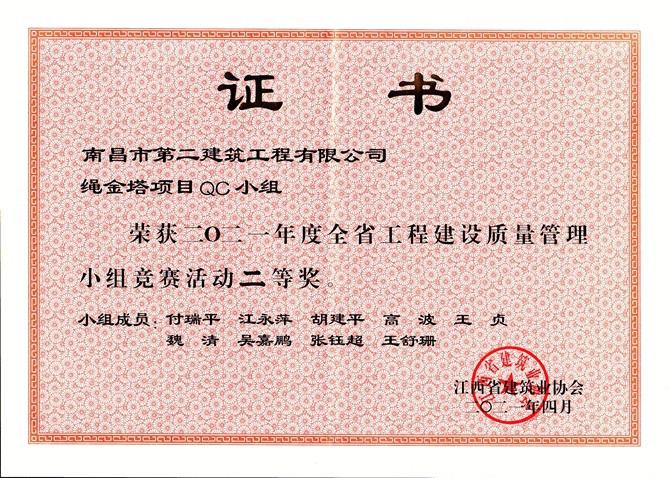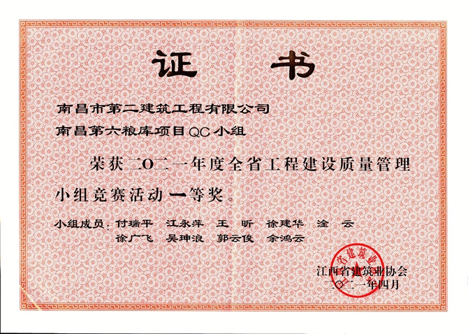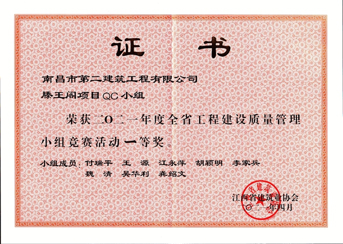 4月27日,江西省建筑業(yè)協(xié)會(huì)召開全省建筑業(yè)全面質(zhì)量管理成果發(fā)布會(huì),我司報(bào)送參賽的南昌第六糧庫項(xiàng)目QC小組的《提高軟弱地基強(qiáng)夯施工一次驗(yàn)收合格率》QC成果和滕王閣項(xiàng)目QC小組的《提高古建砼戧梁驗(yàn)收合格率》QC成果獲得一等獎(jiǎng),繩金塔項(xiàng)目QC小組的《提高高空弧形挑檐施工質(zhì)量》QC成果獲得二等獎(jiǎng),為促進(jìn)企業(yè)技術(shù)創(chuàng)新和科技進(jìn)步、提升企業(yè)品牌形象添勁加力。