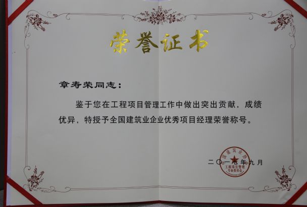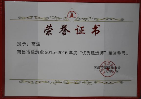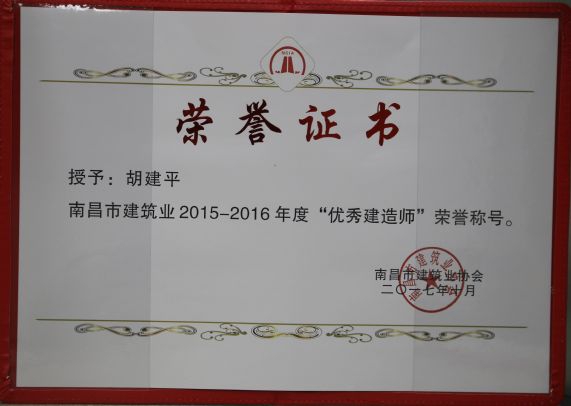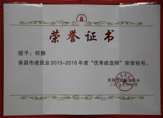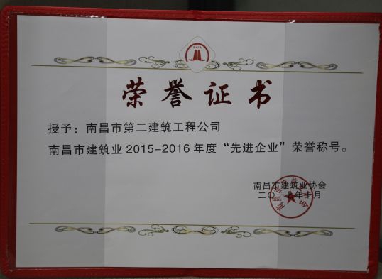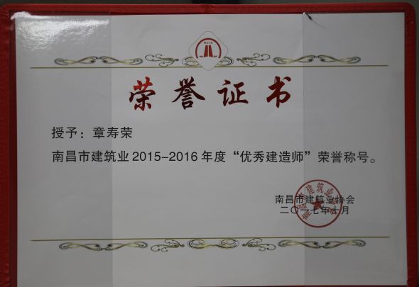 南昌市建筑業(yè)協(xié)會對公司頒發(fā)了南昌市建筑業(yè)2015-2016年度“先進(jìn)企業(yè)”榮譽(yù)稱號,對公司建造師章壽榮、何靜、胡建平、高波頒發(fā)了南昌市建筑業(yè)2015-2016年度“優(yōu)秀建造師”榮譽(yù)稱號;中國建筑業(yè)協(xié)會對章壽榮頒發(fā)了全國建筑業(yè)企業(yè)優(yōu)秀項目經(jīng)理榮譽(yù)稱號。